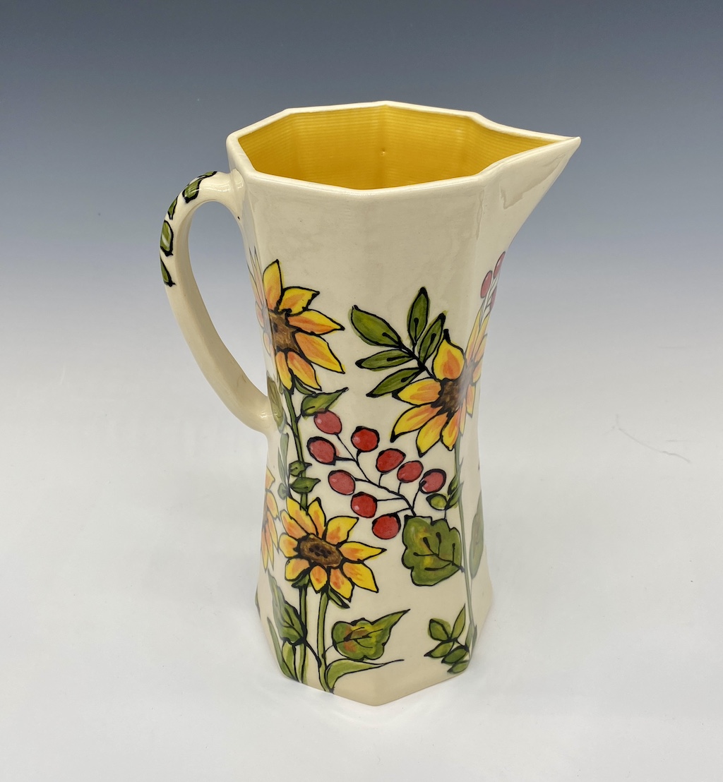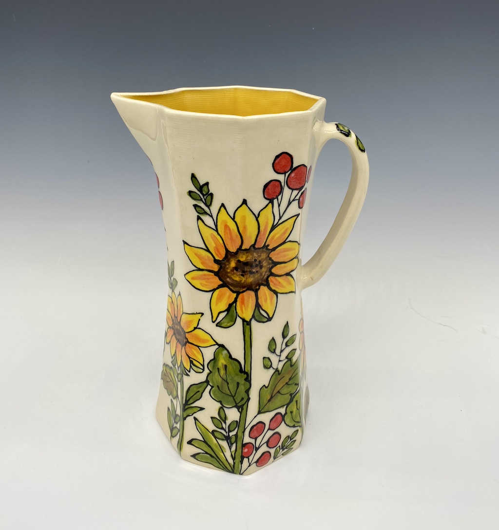 This Large hand painted ceramic pitcher features a cheerful sunflower design, carefully hand-painted with warm yellows, earthy greens, and soft red berry accents. The gently faceted form and flared spout give it an elegant yet organic feel, while the comfortable handle makes it easy to use for everyday serving.