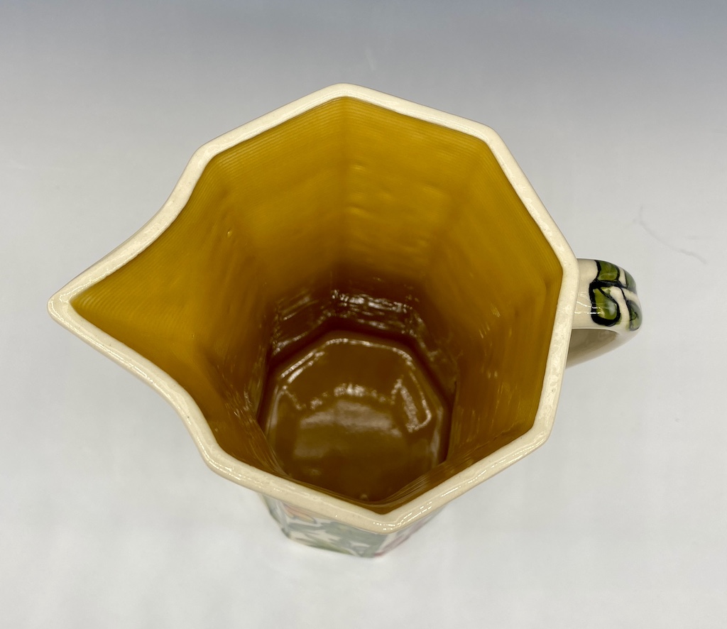 Finished with a creamy white glaze on the exterior and a sunny yellow glaze inside, this pitcher brings a bright, garden-inspired touch to any table or shelf. Each piece is individually made and painted, making it truly one of a kind.