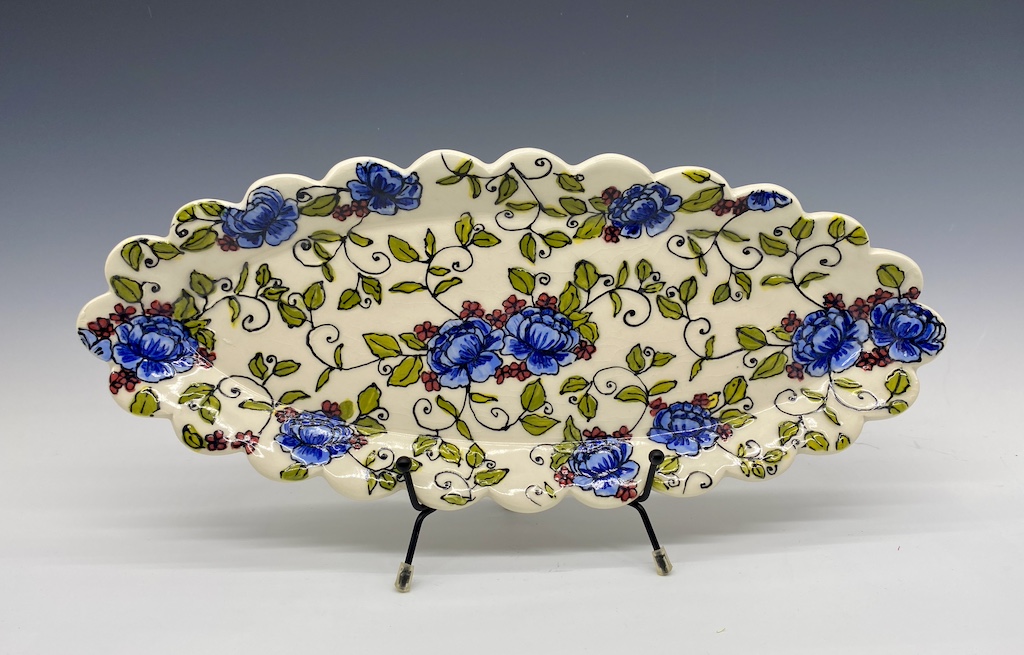 Hand-Painted Peony Oval Scalloped Platter – 14.5” Ceramic Serving Plate